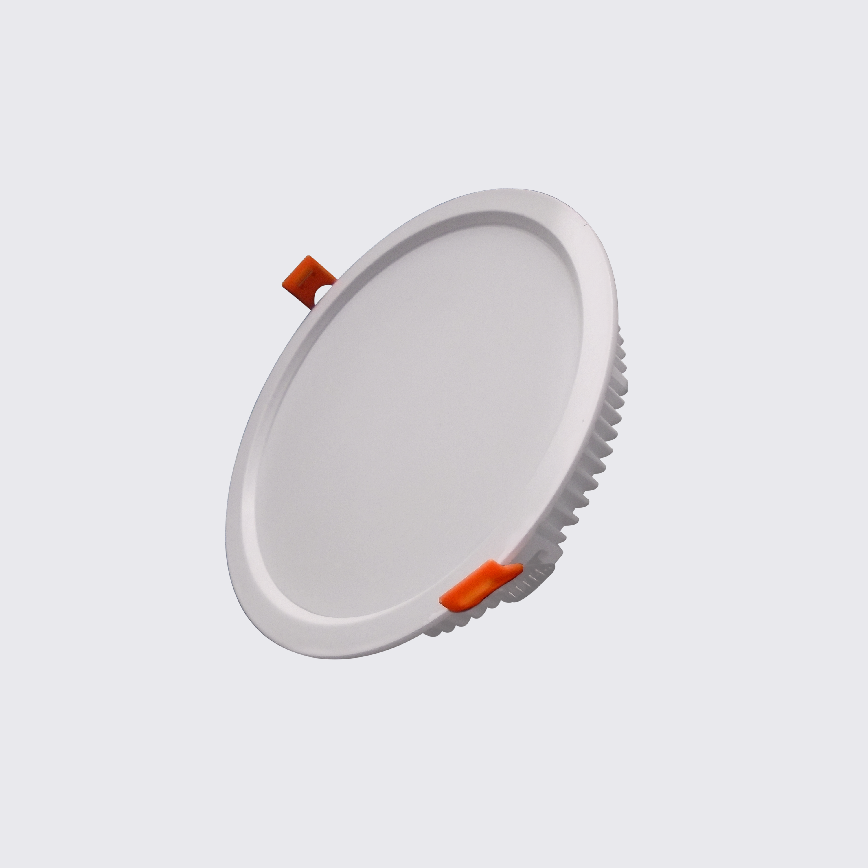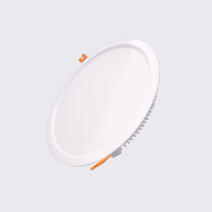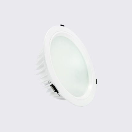 Bala LED recesada 55W para uso interior, con chip Samsung 2835 y atenuación 0–10V. Cuerpo en aluminio inyectado con difusor en policarbonato. Dimensiones: 24.2 cm (diámetro exterior) x 22.2 cm (diámetro interior) x 8.5 cm (profundidad). Peso: 1.60 kg.