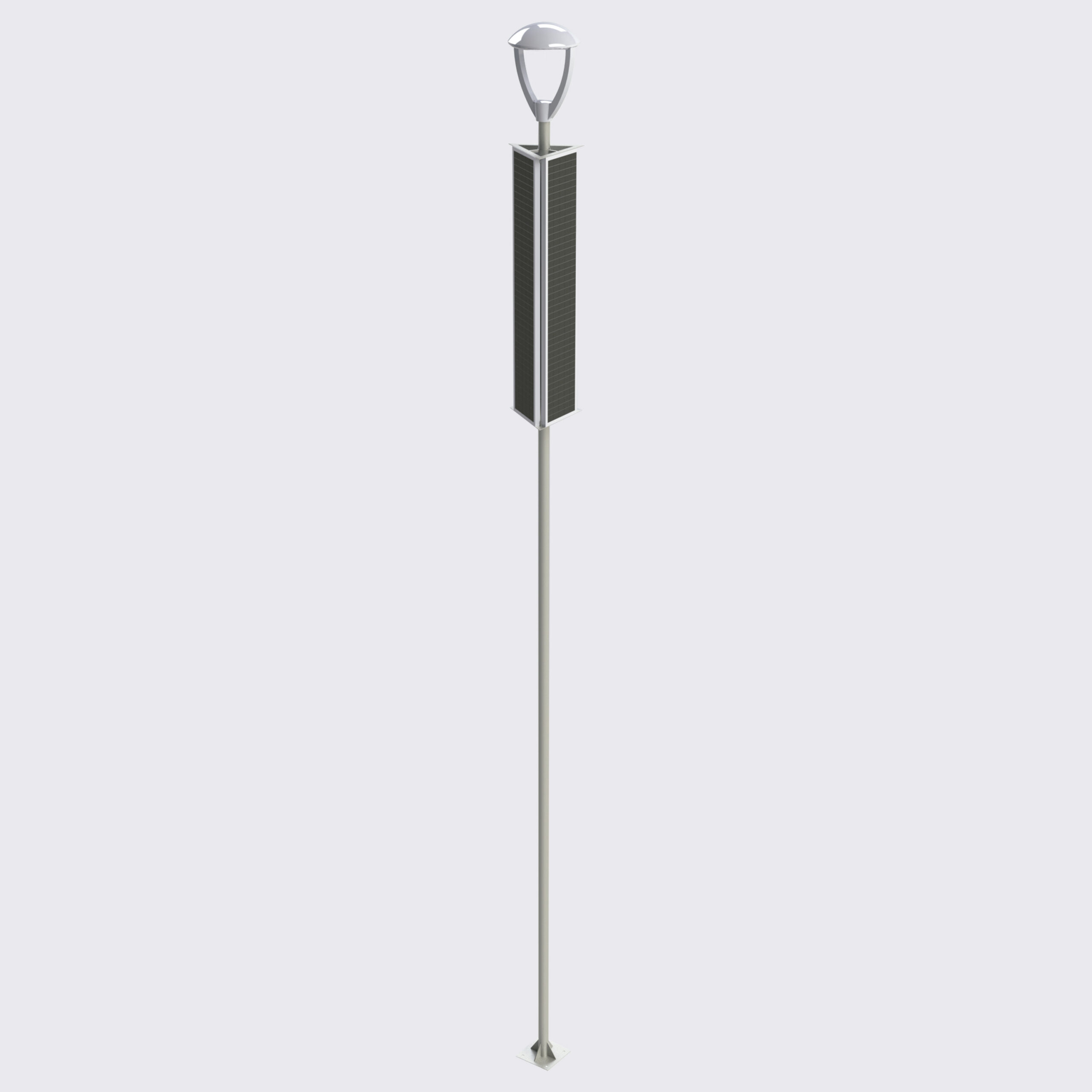 Kit Solar STIL LED Garden 40W, para uso exterior. Cuerpo de la luminaria fabricado en aluminio con protección IP65 e IK08. Incorpora chip Philips Lumileds 3030. Dimensiones de la luminaria: 38 cm (ancho) x 51.2 cm (alto). Altura de instalación: 6.89 m. Dimensiones del panel solar:  34 cm (ancho) x 150 cm (alto). Peso total: 38.6 kg.