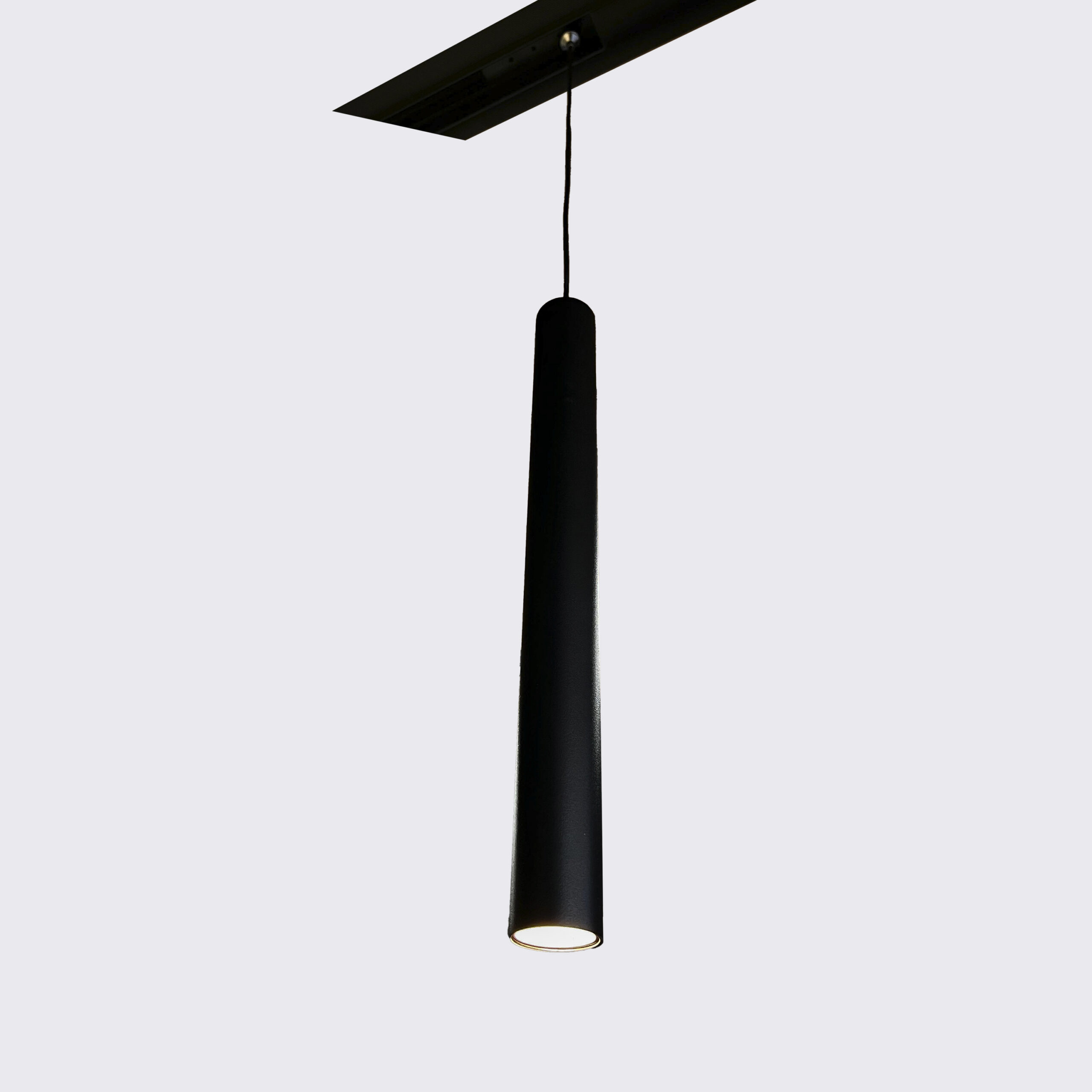 Luminaria LED Vento péndulo 12W con chip Bridgelux, temperatura de color ajustable (3000K / 4000K / 6000K). Cuerpo en aluminio inyectado con pintura electrostática. Dimensiones: 30 cm (largo) x 3 cm (diámetro). Peso: 0.24 kg.