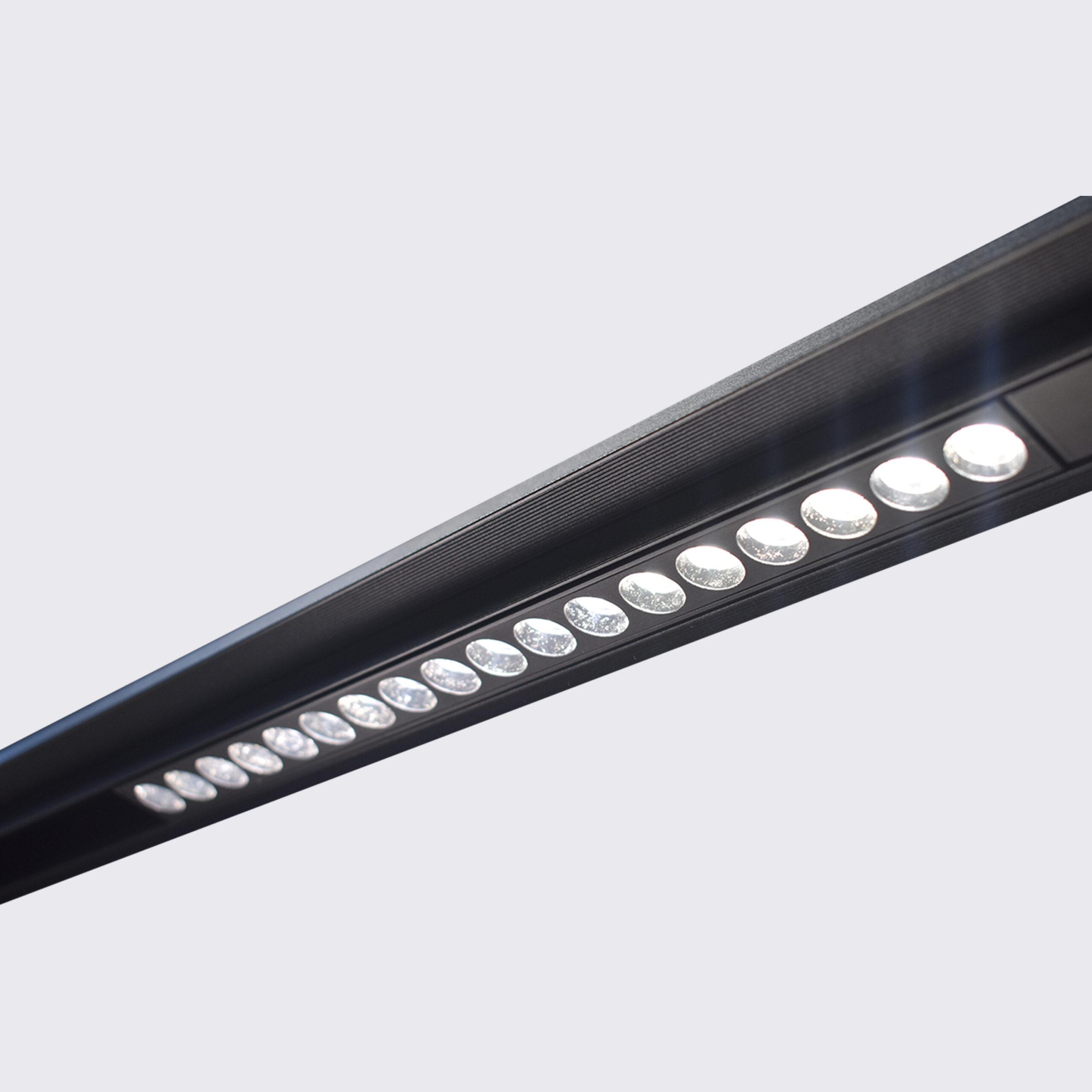 Luminaria LED Vento Track 18W con chip Bridgelux, temperatura de color ajustable (3000K / 4000K / 6000K). Cuerpo en aluminio inyectado con pintura electrostática. Dimensiones: 32 cm (largo) x 2 cm (ancho) x 4 cm (alto máx.). Peso: 0.19 kg.